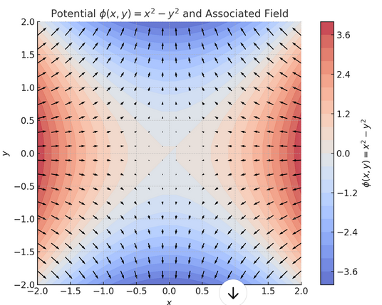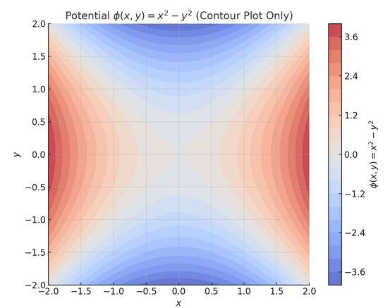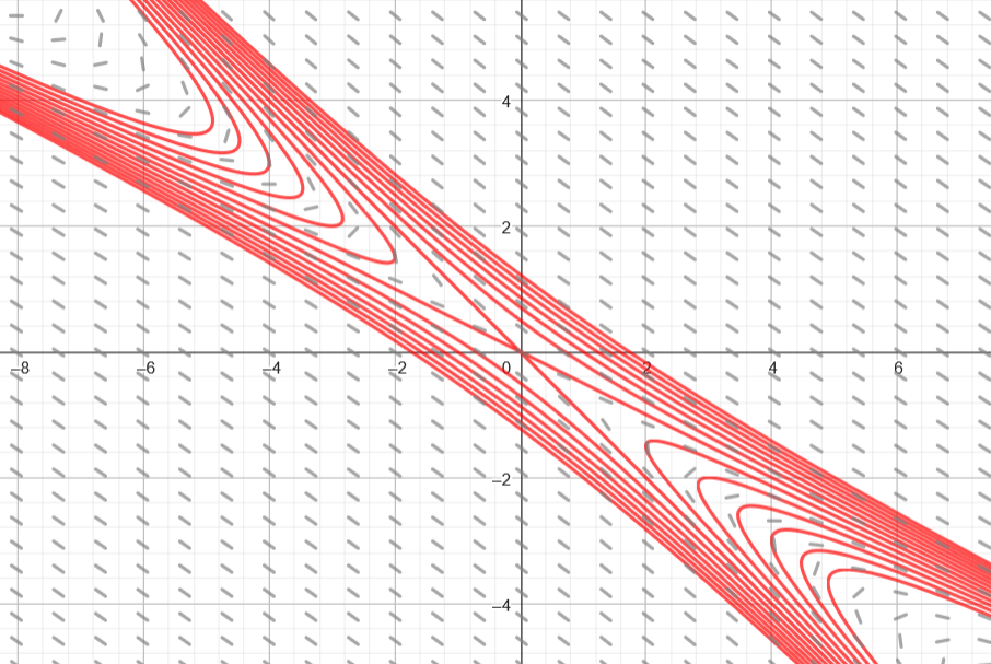 Veja, para a EDO \(2x \,dx - 2y\, dy=0\), as soluções são da forma \(x^2-y^2=C\). Assim, para cada \(C\) temos uma solução particular da EDO e também uma curva de nível do potencial \(f(x,y)=x^2-y^2\). Que viagem, né?