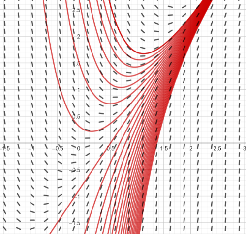 O campo de direções da EDO é apesentado na figura a seguir. As curvas vermelhas representam as curvas integrais: