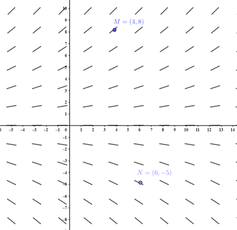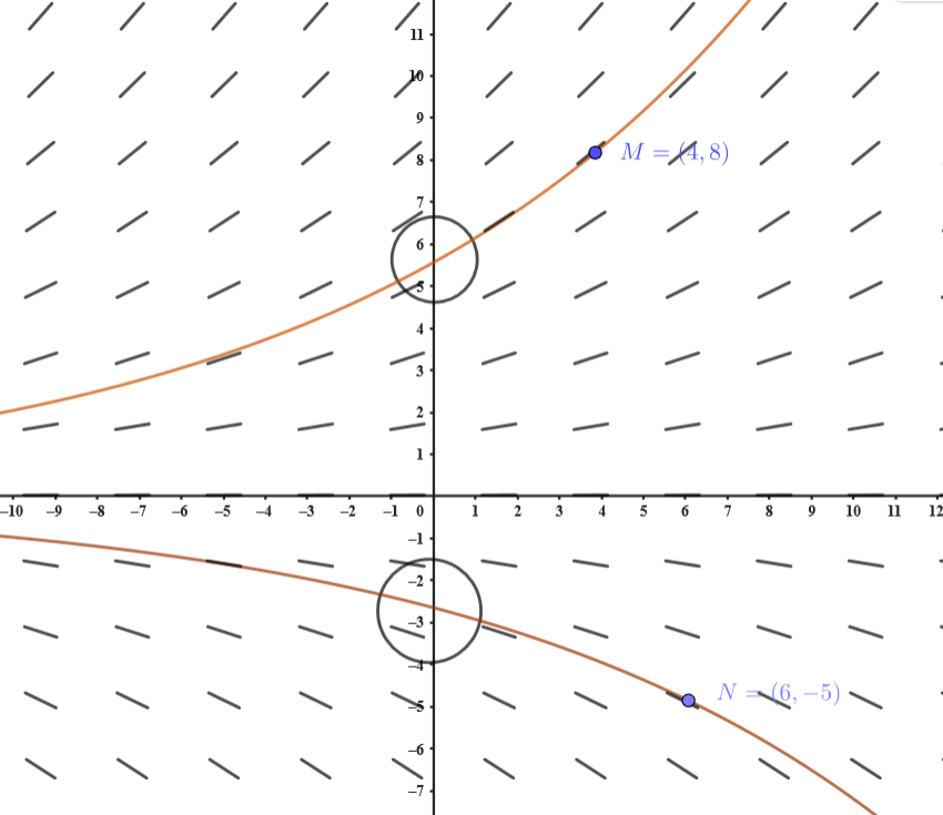 A solução que passa por \(M\) é crescente, pois começou com saldo positivo, e a derivada portanto é positiva. Já a solução que passa por \(N\) é decrescente, pois começou com saldo negativo. Isso reflete a diferença entre investir dinheiro poupado (saldo positivo) e pedir um empréstimo que não consegue pagar (saldo negativo). Ambos crescem exponencialmente, mas em direções opostas: um traz alegria e o outro, ansiedade!